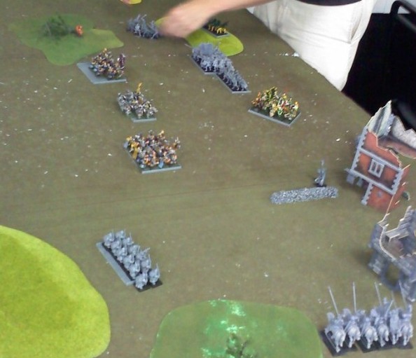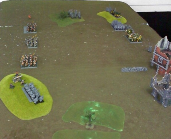 Deployment - I (Brian) put the Thane and his Ironbreakers in the center flanked by Warriors on each side, Cannon and Thunderers on the hill and Gurni, my Dragon Slayer, ready to run through the woods, hopefully giving him enough protection to make it far enough to charge some manlings. Ryan places his Empire Spearmen (with detachment) and Halberdiers across from my infantry with Hazim on one flank and his ranged units on the other, mirroring my own hill. His knights are placed a little out of the bottom right hand of the picture and his scounting Huntsmen are placed nice and close to my slayer in the woods.