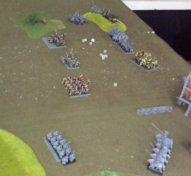 6th Turn - I move around my dwarfs on my right flank to make sure I capture both table quarters on that side(that knight behind my Warriors above is their captured standard), As the Ironbreakers fight on with the Spearmen and Free Company, winning combat but failing to break the stubborn (not actually Stubborn) Spearmen and detachment. Ryan is able to rally his Huntsmen and fire on my remaining dwarfs with his mortar, actually taking out 2 of my dwarf Warriors from across the board, but it is not enough to cause any panic tests. The Ironbreaker/Spearmen combat amazingly continues without a break.