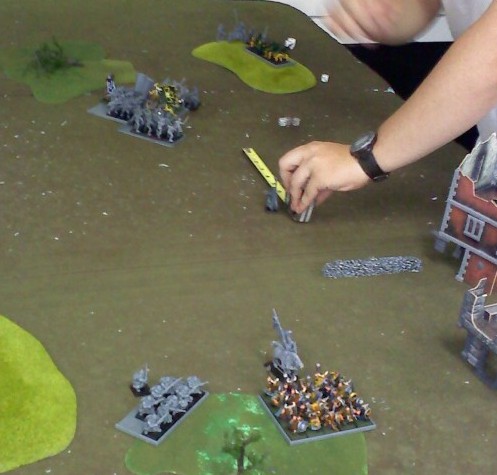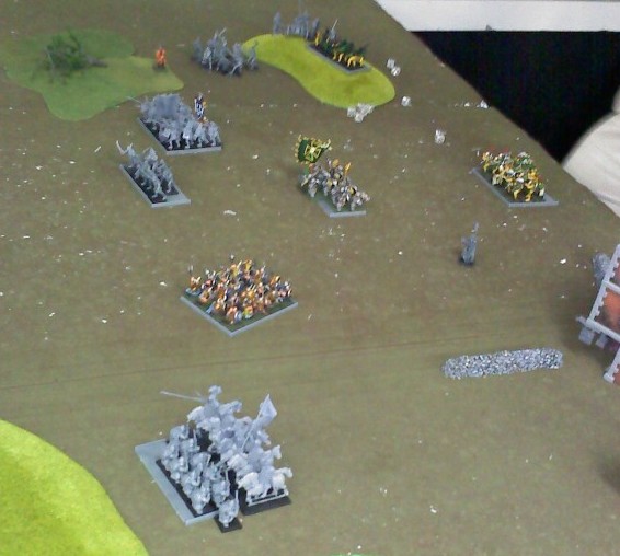 5th Turn - The Ironbreakers charge the Spearmen, and are counter charged by the detachment. My warriors hit the Knights in the rear. The Ironbreakers kill some spearmen while avoiding any casualties of their own, but still lose the combat and pass their break test. The Knights fail theirs and run to the edge of the board. During Ryan's turn, his handgunners sit useless for the minute while his archers charge the other flank of the Ironbreakers and he maneuvers his Battle Wizard in postion for a Cleansing Flare at the Ironbreakers (which is dispelled). The Ironbreakers are then able to deal out 4 wounds while making all of their 2+ armour saves, winning the combat. The Huntsmen break from the combat. (Picture below is from the middle of the 5th Turn)